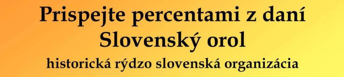Milí priatelia a priaznivci Slovenského Orla, obraciame sa na vás s prosbou o poukázanie 2 % pre našu organizáciu. Váš príspevok výrazne napomôže realizácii našich podujatí, keďže financovanie z iných zdrojov je v posledných rokoch veľmi obmedzené.